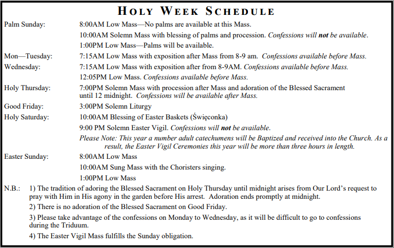 Stations of the Cross will be held every Friday during Lent immediately before Mass. The Holy Hour will begin at 5:00pm. The schedule will be: • Holy Hour 5:00PM–5:50PM • Confessions 5:30PM–5:50PM • Stations of the Cross 6:00PM • Mass 6:35PM Devotions to Our Lady of Czestochowa will continue to be said following Mass.